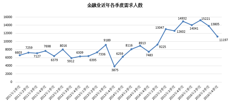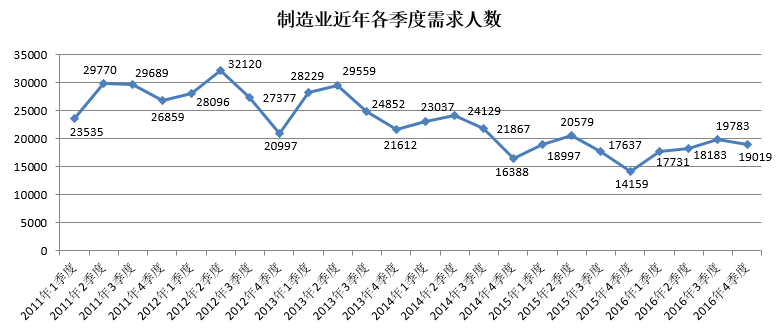 4.制造行业总体人才需求在经过连续两年持续下滑后,2016年出现回暖,本季度其需求人才数达到19783人,与上年同期的14159人相比增加4860人,同比涨幅达到34.32%。