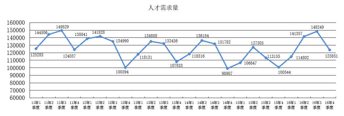 2016年第四季度,通过广西人才网联系统招聘人才的用人单位共10431家,与上年同期相比上涨8.57%。2016年第四季度需求走势呈现明显的季节性回落,人才需求量达到123851人,同比涨幅达到23.18%,仅次于2011年第四季度达到的峰值。