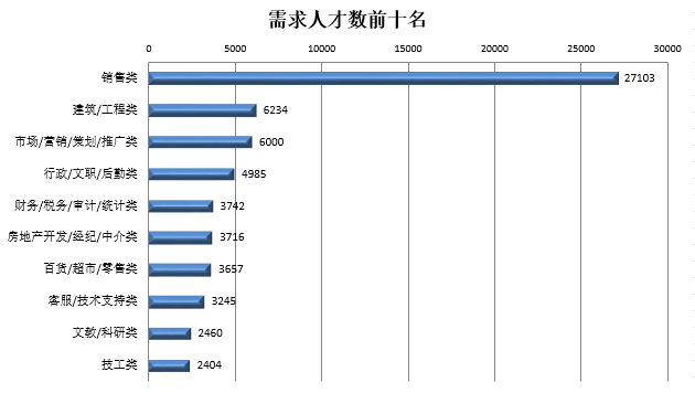 1.位居需求榜前十名的职位:销售类、建筑/工程类、市场/营销/策划/推广类、行政/文职/后勤类、财务/税务/审计/统计类、房地产开发/经纪/中介类、百货/超市/零售类、客服/技术支持类、文教/科研类及技工类等职位类型。这十个职位类型的需求人才数总计63546人,占人才总需求量的51.31%,其中销售类职位需求长期以绝对优势位居首位,其需求人才数达到27103人,比上年同期增加1954人,小幅增长7.77%。