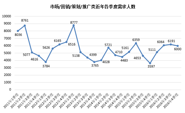 2.市场/营销/策划/推广类职位人才需求量达到6000人,与上年同期的3597人相比增加2403人,增幅达到66.81%。
