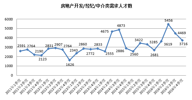 3.房地产开发/经纪/中介类职位人才需求量为3716人,环比呈现下滑,环比下降16.85%,但与上年同期的2681人相比仍增加1035人,大幅增长38.60%。