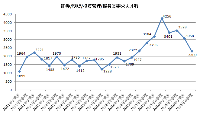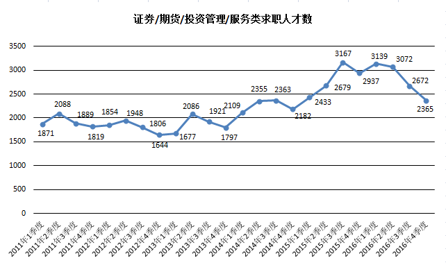 2016年第四季度,受股市低迷影响,广西人才网联系统中证券/期货/投资管理/服务类职位的人才供应呈现持续下跌走势,其求职人才数为2365人,与上年同期相比减少572人,同比下滑19.48%,环比下滑11.49%。