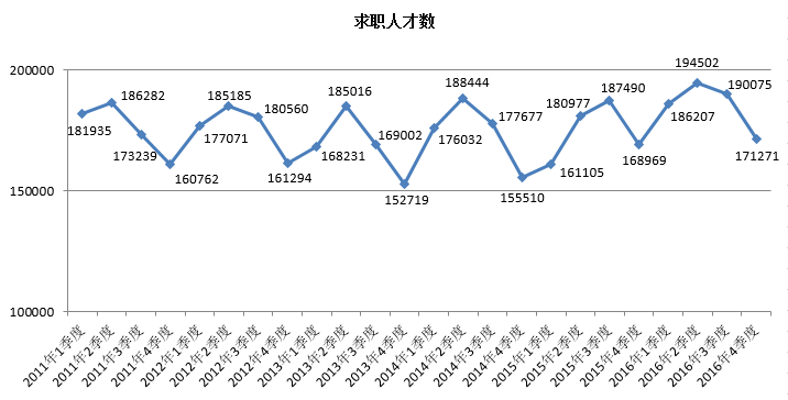 2016年第四季度,广西人才网联系统的求职人才数达到171271人,季节性回落明显,但比上年同期仍小幅增长了1.36%,是近六年来第四季度最高水平。