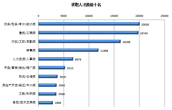 1.位居求职榜前十名的职位:财务/税务/审计/统计类、建筑/工程类、行政/文职/后勤类、销售类、人力资源/人事类、市场/营销/策划/推广类、物流/仓储类、文教/科研类、房地产开发/经纪/中介类及文教/科研类等职位类型。这十个职位类型求职人才数量总计94057人,占总求职人才数54.92%。其中,财务/税务/审计/统计类、建筑/工程类及行政/文职/后勤类这三类职位类型求职人才数位居前三位,均超过16000人。