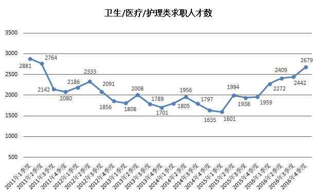 医院/医疗/护理类职位的求职人才数呈现明显的上扬走势,2016年第四季度求职人才数为2679人,与上年同期相比增加720人,同比涨幅达到36.75%。其中,护士/护理人员和药库主任/药剂师是该职位求职人才增长的主要来源,分别比上年同期分别增加180人和53人,涨幅分别达到109.76%和84.13%。