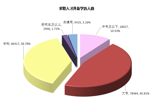 2016年第四季度,广西人才网联系统求职人才学历依旧集中在大专和本科学历,其求职人才数占比分别为45.81%和38.78%,大专和本科学历的求职人才共计144881人,与上年同期的145365人相比基本持平。