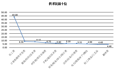 其中,由于需求极少,化工类、计算机硬件开发类及服装/纺织/皮革类等职位就业竞争压力较大,其供求比分别高达43.00、8.36及8.10,位居供求比前三位;而服务业三类职位和销售类等职位依旧垫底,其合计供求比分别仅为0.47和0.44。