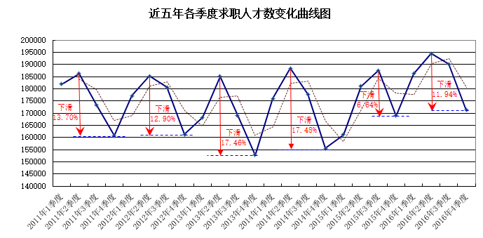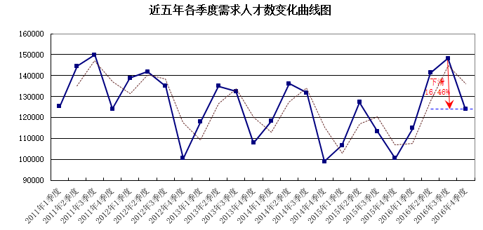 2016年广西人才网联系统中用人单位对人才的需求同比增长较大,其人才需求量为528349人,与上年度相比增加83201人,大幅增长18.69%,虽然季节性变动轨迹依旧明显,2016年第四季度需求人才量与第三季度最高点相比下滑16.46%,但是仍接近上年度第二季度的最高水平。