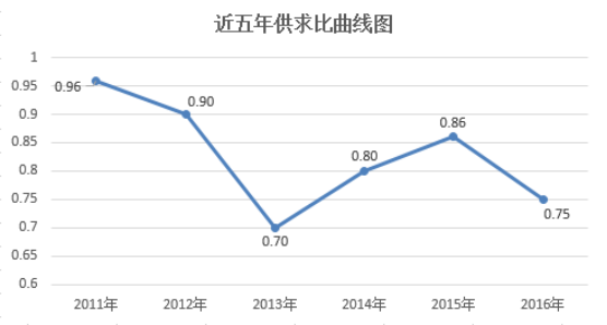 广西人才网联系统数据显示,2016年广西人才网联系统中用人单位数量为17596家,比上年度增长3.92%,需求人才数为528349个,比上年度增长18.69%,而求职人才数为398829人,比上年度增长4.45%,总人才供求比为0.75(即人才需求人数或职位数为1时,人才供给或求职人才数为0.75,下同)。