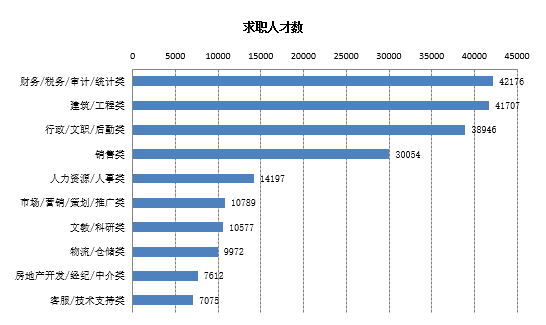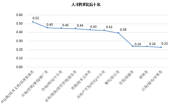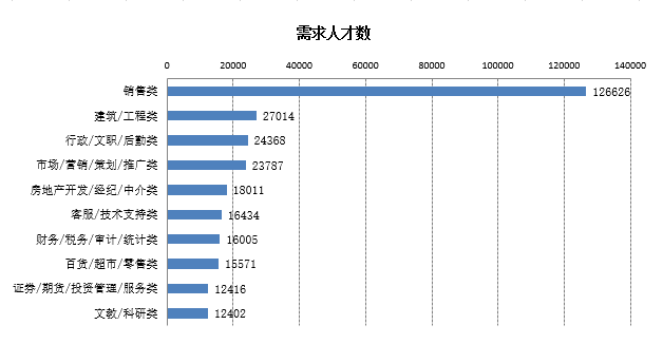 2016年广西人才网联系统人才供求比为0.75,总人才缺口为129520人,在54个主要职位类别中,人才缺口主要集中在服务类、业务类和互联网类职位中。人才缺口前十位的职位类别如下:销售类96572人;市场/营销/策划/推广类12998人;百货/连锁/超市/零售类12043人;房地产开发/经纪/中介类10399人;客服/技术支持类9359人;证券/期货/投资管理/服务类6904人;餐饮/娱乐类4956人;技工类4863人;互联网产品/运营管理/电子商务类2233人;及IT运维/技术支持/系统集成类2054人。这十个职位类别合计人才缺口达到162381人,合计人才供求比仅为0.33。