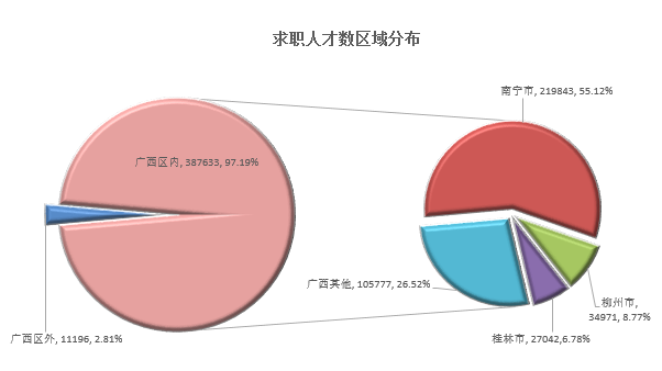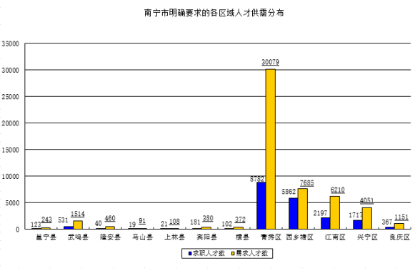 其中期望在南宁市工作的求职人才数达到219843人,占比55.12%,而工作地在南宁市的需求人才数达到311741人,占比59.00%。对南宁市具体工作区域没有明确要求的求职人才有199901人,占比50.12%,而有明确要求的区域中,南宁市青秀区和西乡塘区是比较热门的求职地点,求职人才数分别有8782人和5862人,明确工作地在这两个区的用人单位需求人才数分别达到30079人和7685人。