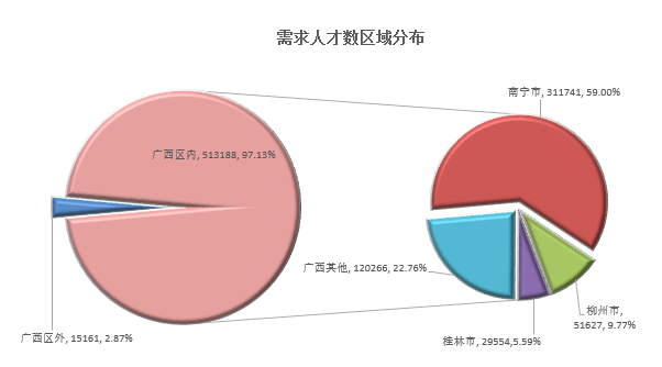 2016年广西人才网联系统中广西区内需求人才数为513188人,占比97.13%,而期望在广西区内工作的求职人才数为387633人,占比97.19%,同比增长0.53个百分点。