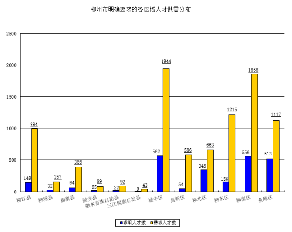 期望在柳州市工作的求职人才数为34971人,占比8.77%,工作地在柳州市的需求人才数达到51627人,占比9.77%。对柳州市具体工作区域没有明确要求的求职人才有32481人,占比8.14%,而有明确要求的区域中,柳州市城中区和柳南区是比较热门的求职地点,求职人才数分别为562人和556人,明确工作地用人单位需求人才数也集中在这两个区域,需求人才数分别为1944人和1858人。