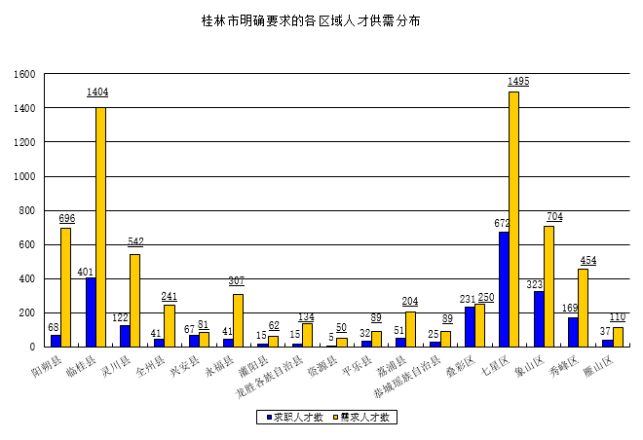 期望在桂林市工作的求职人才数为27042人,占比6.78%,工作地在桂林市的需求人才数为29554人,占比5.59%。对桂林市具体工作区域没有明确要求的求职人才有24727人,占比6.20%,而有明确要求的区域中,桂林市七星区是比较热门的求职地点,求职人才数有672人,明确工作地在这个区的用人单位需求人才数为1495人。