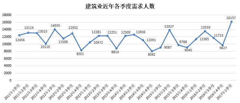 3.建筑业人才需求本季度同比增长量跃居第二,其人才需求量达到16157人,与上年同期的11385人相比增加4772人,涨幅达到41.91%。