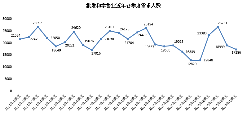 4.批发和零售业人才需求在贸易/进出口行业的带动下继续维持增长态势,本季度批发和零售行业人才需求量达到17286人,比去年同期增加4438人,大幅增长34.54%。