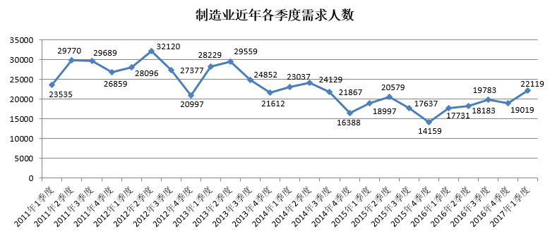 5.制造行业总体人才需求呈现回升态势,需求人才数达到22119人,与去年同期的17731人相比增加4388人,同比涨幅达到24.75%。