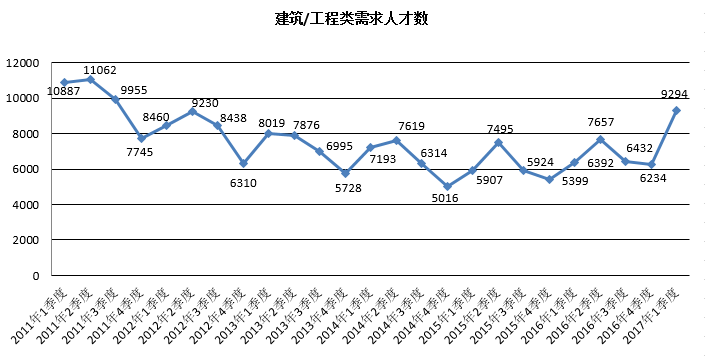 2017年第一季度,广西人才网联系统中建筑/工程类职位的人才供应持续增长,其求职人才数为22906人,与上年同期相比增长1230人,同比小幅增长5.67%,环比涨幅为16.04%,创历史新高。