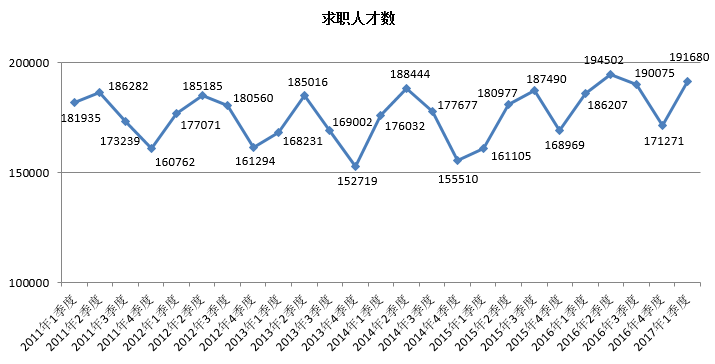 2017年第一季度,广西人才网联系统的求职人才数达到191680人,比上年同期小幅增长了2.94%,近六年来第一季度首次超过190000人。