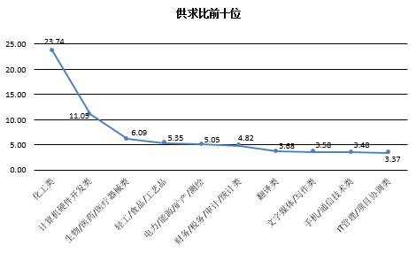 其中,由于需求极少,化工类、计算机硬件开发类及生物/医药/医疗器械类等职位就业竞争压力较大,其供求比分别高达23.74、11.05及6.09,位居供求比前三位;而服务业三类职位和销售类等职位人才供求比依旧垫底,其合计供求比分别仅为0.50和0.39。