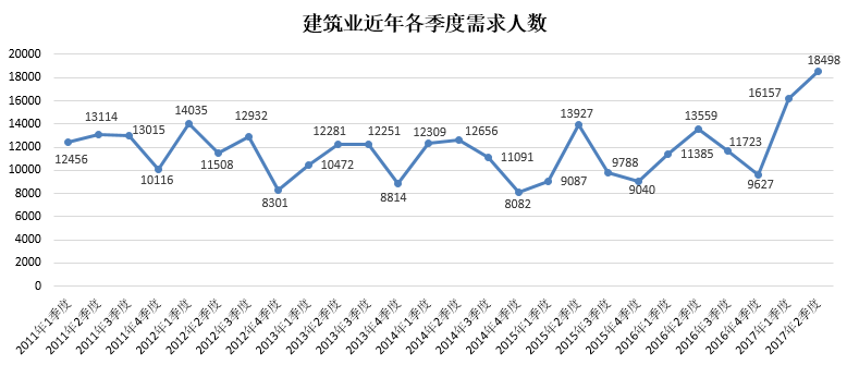 3.建筑业人才需求持续走高,达到历年最高值,人才需求量达到18498人,与上年同期的13559人相比增加4939人,涨幅达到36.43%。