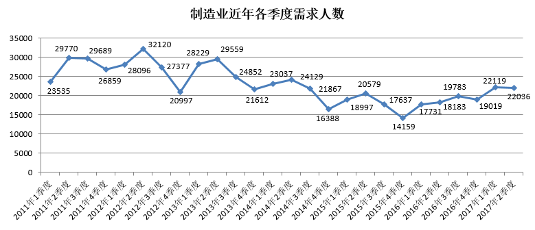 4.制造行业总体人才需求从2015年第四季度达到谷底后持续回升,本季度需求人才数为22036人,虽然与三年前同期相比仍有差距,但与去年同期的18183人相比仍增加3853人,同比涨幅为21.19%。