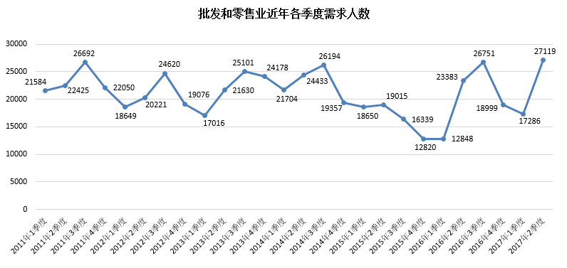 广西人才网联系统的数据显示,2017年二季度批发和零售行业人才需求量达到27119人,比去年同期增加3736人,大幅增长15.98%,再创新高。但该行业中,传统零售行业的人才需求持续下滑,其需求增长的主要动力来源于贸易/进出口行业,该行业得益于中国-东盟自由贸易区的不断发展和国家“一带一路”倡议推进,其人才需求量在近年来不断上升,本季度达到13081人,比上年同期增加5376人,同比涨幅达到69.77%。