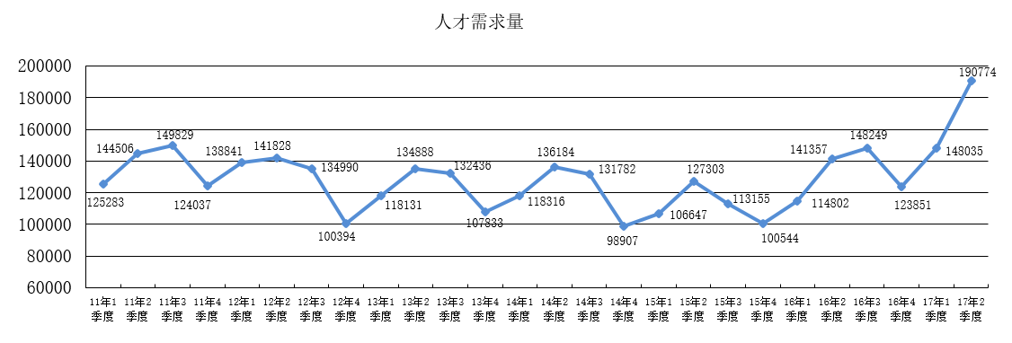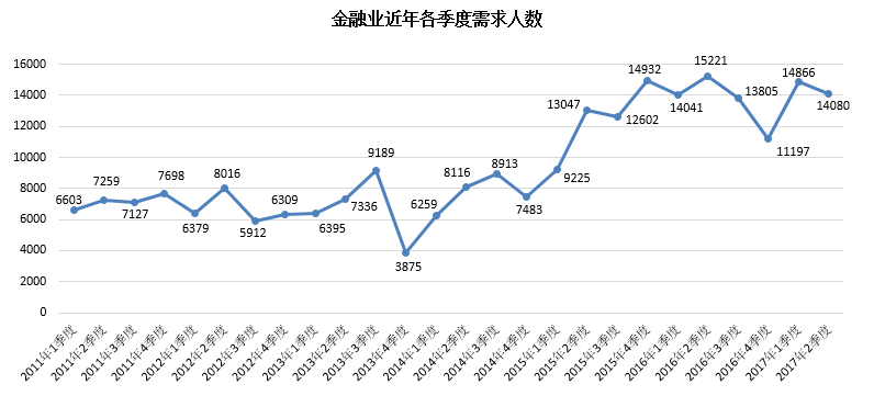2017年第二季度,金融行业需求人才数为14080人,与去年同期相比减少1141人,同比下滑7.50%。