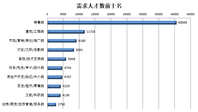 1.位居需求榜前十名的职位:销售类、建筑/工程类、市场/营销/策划/推广类、行政/文职/后勤类、客服/技术支持类、财务/税务/审计/统计类、房地产开发/经纪/中介类、百货/超市/零售类、文教/科研类及证券/期货/投资管理/服务类等职位类型。这十个职位类型的需求人才数总计96303人,占人才总需求量的50.48%,其中销售类职位需求长期以绝对优势位居首位,其需求人才数达到40509人,比上年同期增加5557人,大幅增长15.90%。