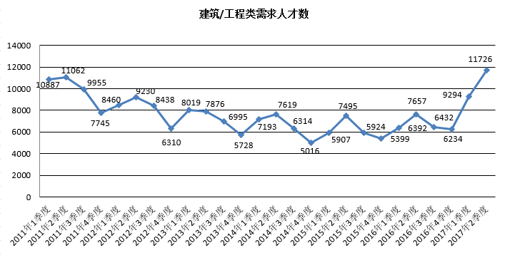 1.建筑/工程类职位人才需求创新高,其需求增长量稳居第二