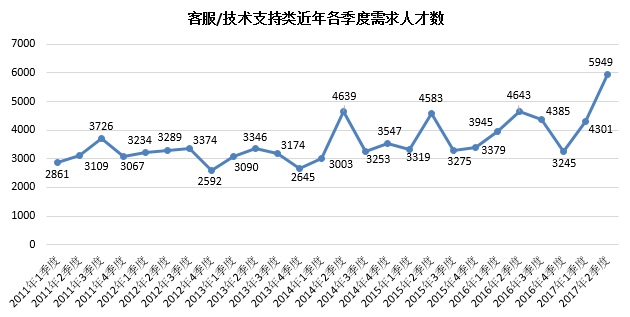 3.客服/技术支持类职位人才需求首次逼近6000人