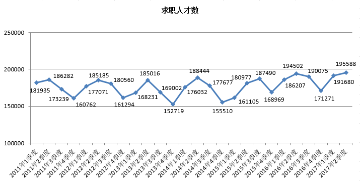 2017年第二季度,广西人才网联系统的求职人才数达到195588人,人才供应稳中有升,同比微涨0.56%,达到历年来最高值。