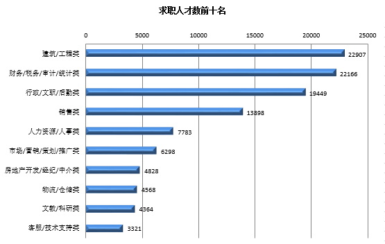 1.位居求职榜前十名的职位:建筑/工程类、财务/税务/审计/统计类、行政/文职/后勤类、销售类、人力资源/人事类、市场/营销/策划/推广类、房地产开发/经纪/中介类、物流/仓储类、文教/科研类及客服/技术支持类等职位类型。这十个职位类型求职人才数量总计109582人,占总求职人才数56.03%。其中,建筑/工程类、财务/税务/审计/统计类及行政/文职/后勤类这三类职位类型求职人才数位居前三位,均超过19000人。