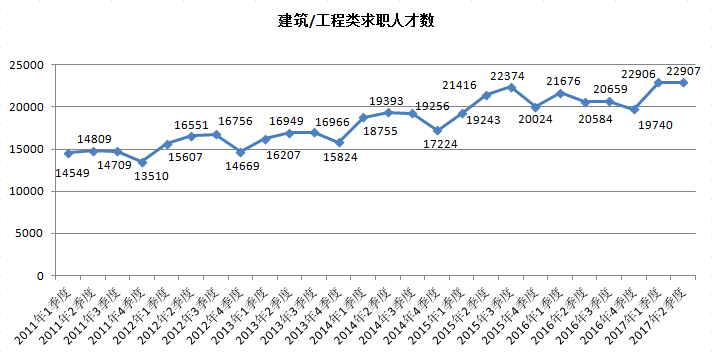 2.建筑/工程类职位的人才供应依旧维持高位,其求职人才数为22907人,与上季度相比基本持平,但同比增长2323人,同比涨幅为11.29%。