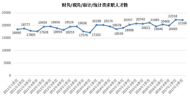 2017年第二季度,广西人才网联系统中财务/税务/审计/统计类职位的人才供应增长量位居第二,其求职人才数为22166人,与上年同期相比增长2520人,同比增长12.83%。