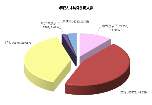 2017年第二季度,广西人才网联系统求职人才学历长期集中在大专和本科学历,其求职人才数占比分别为44.72%和39.05%,大专和本科学历的求职人才共计163848人,与上年同期的162797人相比增加1051人,微涨0.65%。