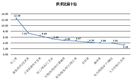 2.化工类、服装/纺织/皮革类及计算机硬件开发类等职位由于需求很少,就业竞争压力较大,其供求比分别高达12.39、7.33及6.44,位居供求比前三位;而服务业三类职位和销售类等职位人才供求比依旧位居供求比后十位,其合计供求比分别仅为0.49和0.34。