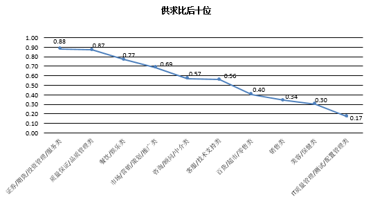 其中,由于需求极少,化工类、服装/纺织/皮革类及计算机硬件开发类等职位就业竞争压力较大,其供求比分别高达12.39、7.33及6.44,位居供求比前三位;而服务业三类职位和销售类等职位人才供求比依旧位居供求比后十位,其合计供求比分别仅为0.49和0.34;另外值得注意的是,由于需求大增,IT质量管理/测试/配置管理类职位的需求人才数达到1616人,而求职人才数仅为276人,缺口为1340人,人才供求比仅为0.17,首次在供求比排名中垫底。