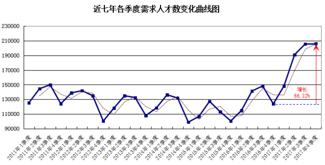 2017年广西人才网联系统中用人单位对人才的需求同比涨幅较大,其人才需求量为762669人,与上年度相比增加了234320人,大幅增长44.35%。其中,与往年第四季度季节性回落不同的是,2017年第四季度需求人才量达到了205987人,创季度需求平台历史新高,与2016年第四季度相比大幅增长66.32%。