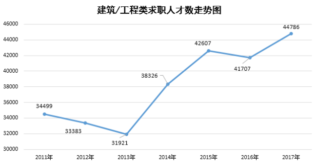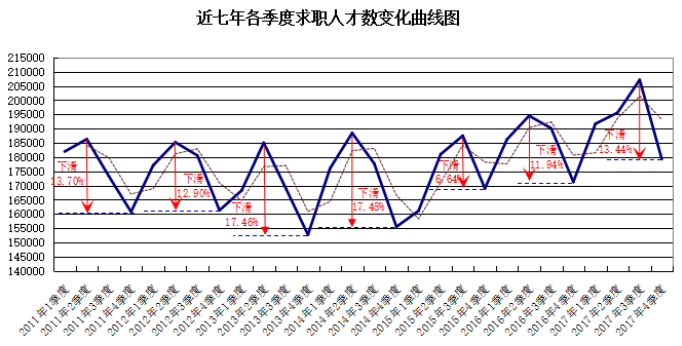 广西人才网联系统中人才供应总量增长乏力,2017年度求职人才数为400604人,与上年度基本持平,微涨0.45%。其中第三季度求职人才数达到近七年各季度求职人才数的最高值。
