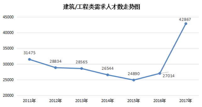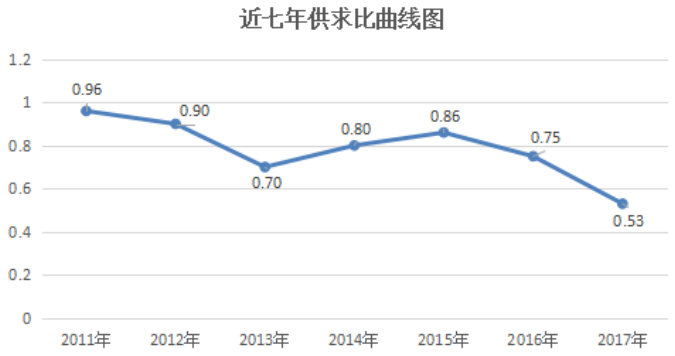 广西人才网联系统数据显示,2017年广西人才网联系统中用人单位数量为20072家,比上年度大幅增长14.07%,需求人才数为762669人,比上年度大幅增长44.35%,而求职人才数为400604人,与上年度基本持平,微涨0.45%,总人才供求比为0.53(即人才需求人数或职位数为1时,人才供给或求职人才数为0.53,下同)。