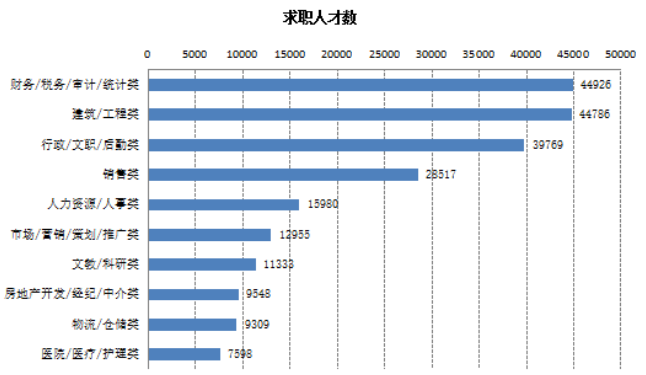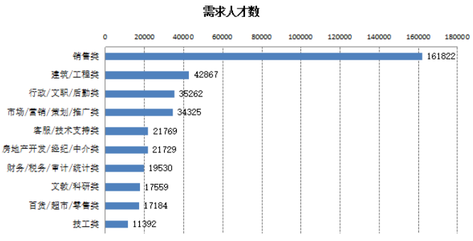 2017年广西人才网联系统人才供求比为0.53,总人才缺口为362065人。在54个主要职位类别中,人才缺口主要集中在服务类、业务类和证券类职位中。人才缺口前十位的职位类别如下:销售类职位人才缺口为133305人;市场/营销/策划/推广类职位人才缺口为21370人;客服/技术支持类职位人才缺口为14718人;百货/超市/零售类职位人才缺口为13531人;房地产开发/经纪/中介类职位人才缺口为12181人;文教/科研类职位人才缺口为6226人;餐饮/娱乐类职位人才缺口为6002人;技工类职位人才缺口为5991人;证券/期货/投资管理/服务类职位人才缺口为4406人;以及美容/保健类职位人才缺口为3315人。这十个职位类别合计人才缺口达到221045人,合计人才供求比仅为0.28。