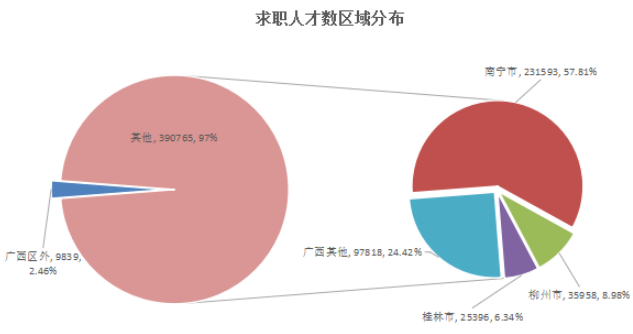 其中期望在南宁市工作的求职人才数达到231593人,占比57.81%,而工作地在南宁市的需求人才数达到497122人,占比65.18%。对南宁市具体工作区域没有明确要求的求职人才有214878人,占比53.64%,而有明确要求的区域中,南宁市青秀区和西乡塘区是比较热门的求职地点,求职人才数分别有7363人和4689人,明确工作地在这两个区的用人单位需求人才数分别达到48243人和13902人。