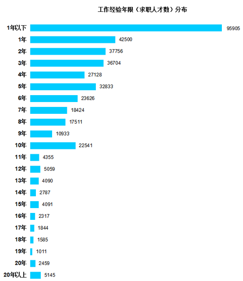 2017年广西人才网联系统中,1年以下工作经验的求职人才有95905人,占比23.94%,1-5年工作经验的求职人才共有176921人,占比达到44.16%,6-10年工作经验的求职人才共有93035人,占比为23.22%,10年以上工作经验的求职人才有34743人,占比为8.67%。