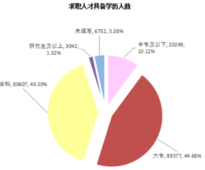 7. 广西人才网联系统求职人才学历长期集中在大专和本科学历,其求职人才数占比分别为44.68%40.30%,大专和本科学历的求职人才共计169984人,与上年同期的161729人相比增加8255人,小幅增长5.10%。