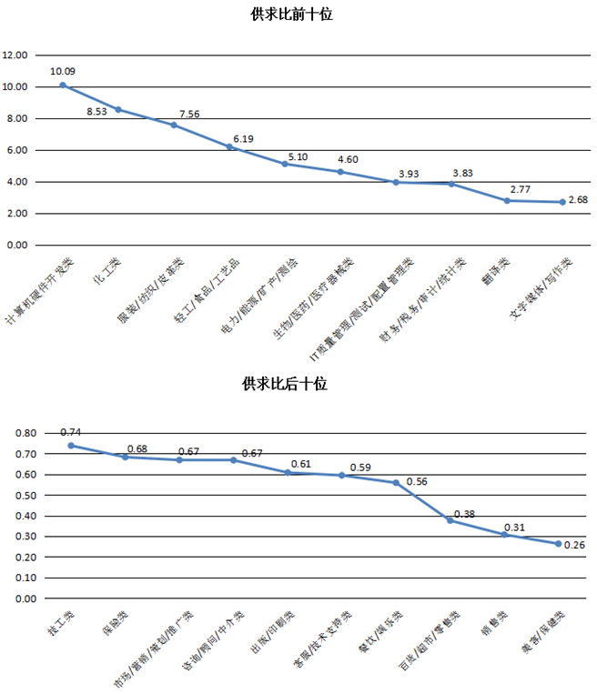 其中,由于需求极少,计算机硬件开发类、化工类及服装/纺织/皮革类等职位就业竞争压力较大,其供求比分别高达10.09、8.537.56,位居供求比前三位;而服务业三类职位和销售类等职位由于人员流动性大等特征,需求长期旺盛,供求比长期位居供求比后十位,其合计供求比分别仅为0.420.31。