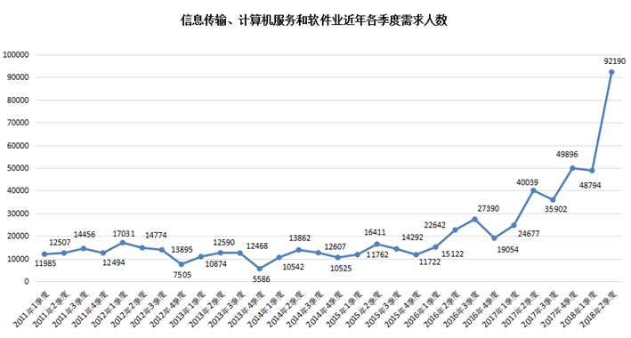 2. 信息传输、计算机服务和软件业人才需求突破性增长,其人才需求量达到92190人,需求占比达到28.34%,比上年同期的40039人增加52151人,涨幅高达130.25%,成为本季度人才需求增长量最大的行业类型。
