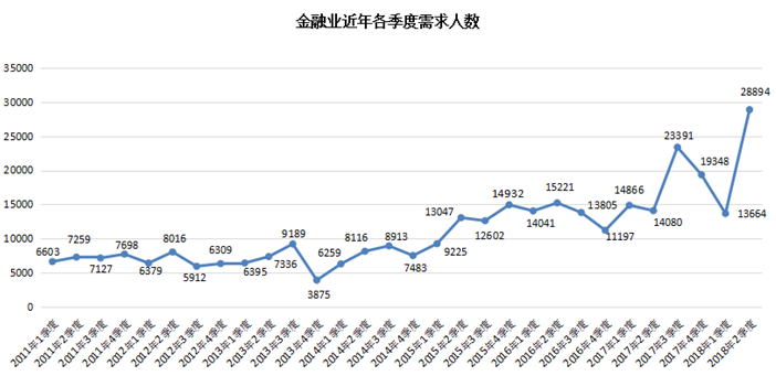 2018年第二季度,广西人才网联系统中金融业人才需求量同比大幅增长,达到28894人,与去年同期的14080人相比增加14814人,同比涨幅高达105.21%。其中金融市场销售业务类职位是该行业的主要增长点。