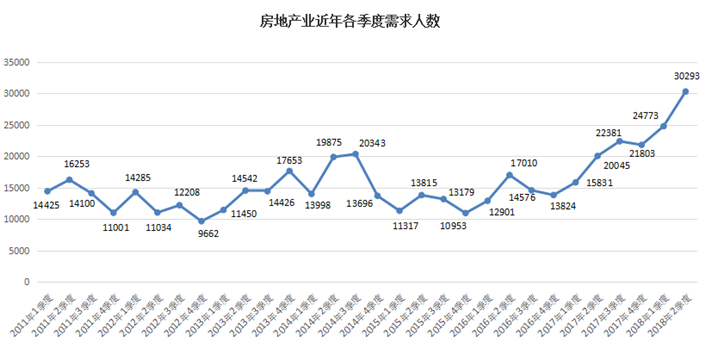 2018年第二季度,房地产行业需求人才数为30293人,与去年同期的20045人相比增加10248人,同比涨幅达到51.12%。其中,房地产中介服务业和房地产开发经营业的人才需求大幅增长,是房地产行业人才需求持续增长的主要支撑,其需求人才数分别达到11620人和10526人,与上年同期相比分别增加了4335人和3022人,同比涨幅达到59.51%和40.27%。