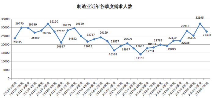 2018年第二季度,制造业需求环比虽稍有回落,但同比涨幅明显,其需求人才数达到27498人,与去年同期的22036人相比增加5462人,同比涨幅达24.79%,其中该行业中需求增长的主要动力来源于快速消费品制造行业和汽车/摩托车(制造/维护/配件)行业,这两个行业的需求人数在本季度分别达到9357人、5632人,比上年同期分别增加了3910人、1152人,同比涨幅达到71.78%、25.71%。